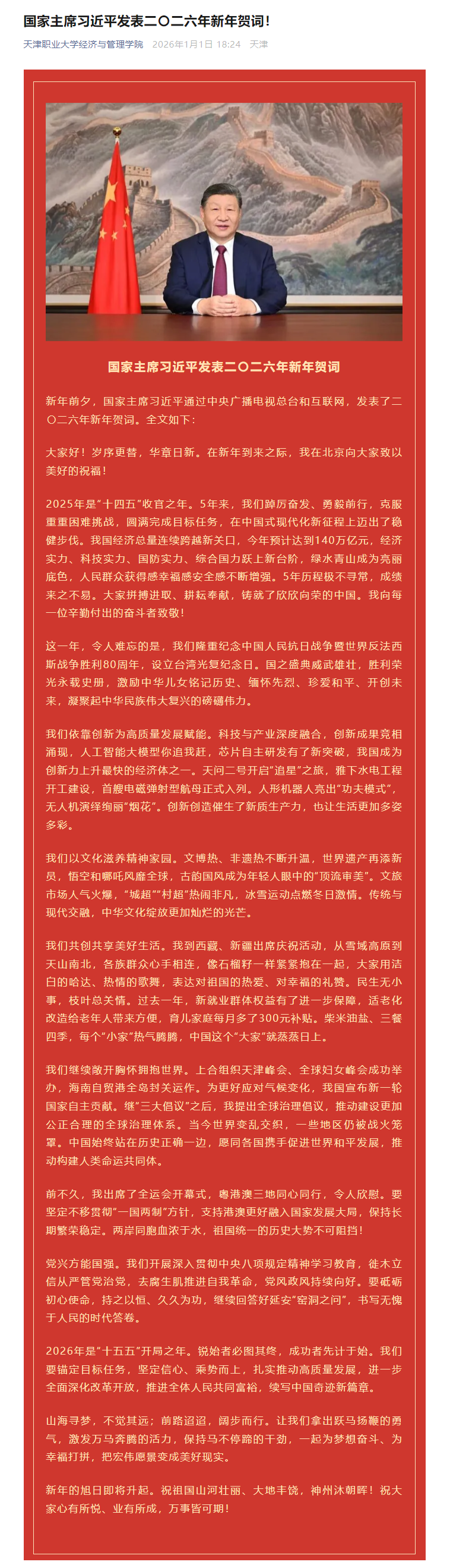 国家主席习近平发表二〇二六年新年贺词!